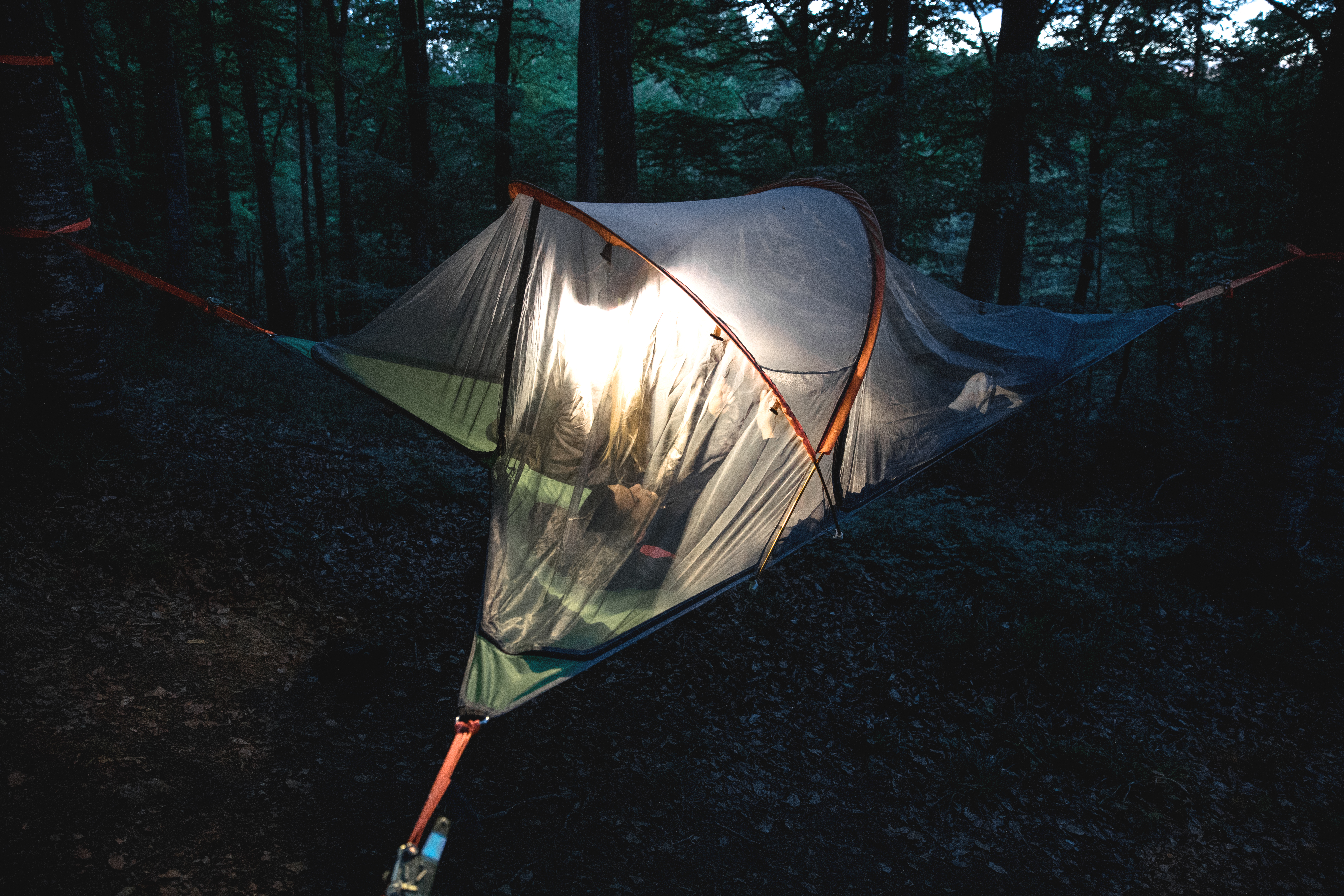 Les tentes suspendues sont installées entre les arbres, permettant ainsi de passer la nuit au milieu du bruissement des feuilles. En cas de pluie, une bâche supplémentaire protège de l’humidité.